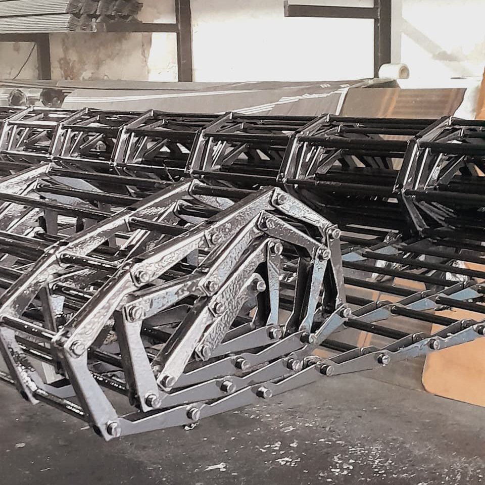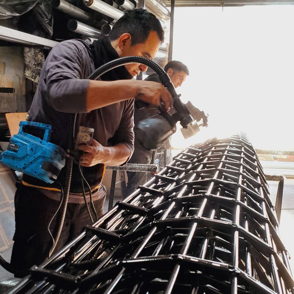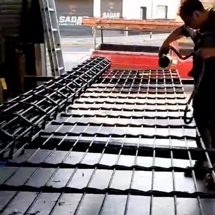 Elaboración: construida en hierros redondos de 3/8 unidos con ligazos en chapa n°18 con soldadura tipo mig formando rectángulos de 24×7 cm.